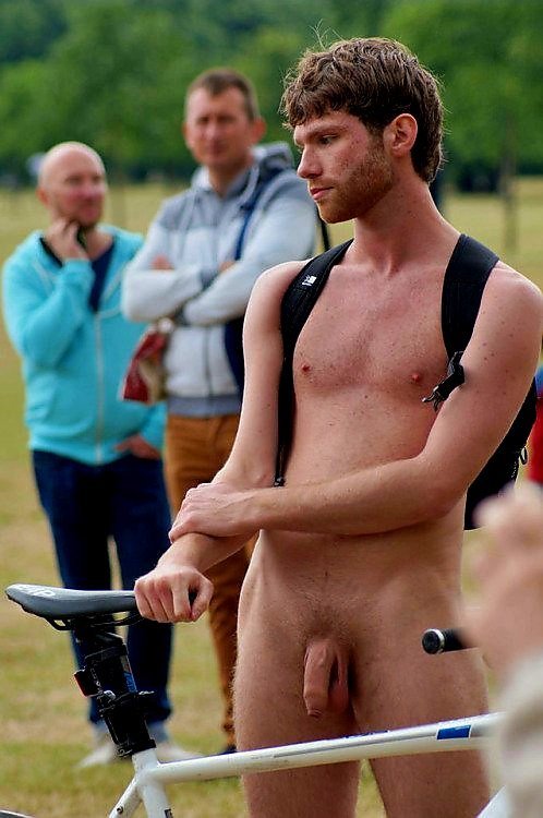 Photos like this one. I didn’t get his name, I took the photo without him knowing, seemingly lost in thought, perhaps aware he was being watched, looked at, maybe trying to keep his mind blank, not thinking sexual thoughts, not looking over at the other naked guys, and definitely, not wanting to be interviewed by that naked reporter who was wandering around the place. He just stood there, quite passive in the cool morning air, the hairs on his arms and legs standing up, staring at no one, not wanting to make eye contact. He had done that a few minutes ago, with the guy on his bike, being photographed by that lycra clad guy, seen the guy bone up. I watched as his face flushed in embarrassment for the guy. I took in his cock, wondering if he would bone up too. It had certainly grown an inch and was now hanging loose away from his ballsac.