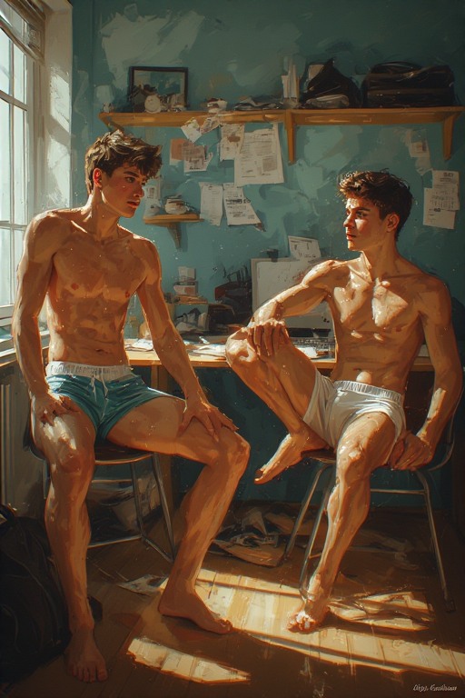 Nate and Kyle are two first year students sharing a room on the university campus. Nate is straight and doing a physical education degree. Kyle is gay and doing fine art. The heating in their room is broken in the “on” position, meaning they have had to make an agreement to hang in just boxers during the day.